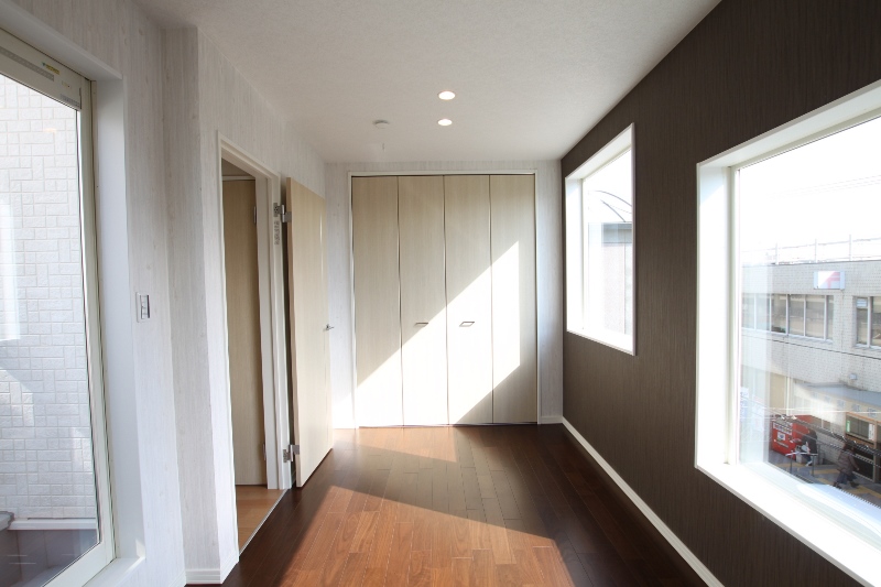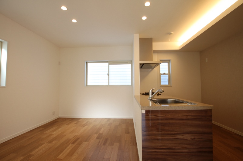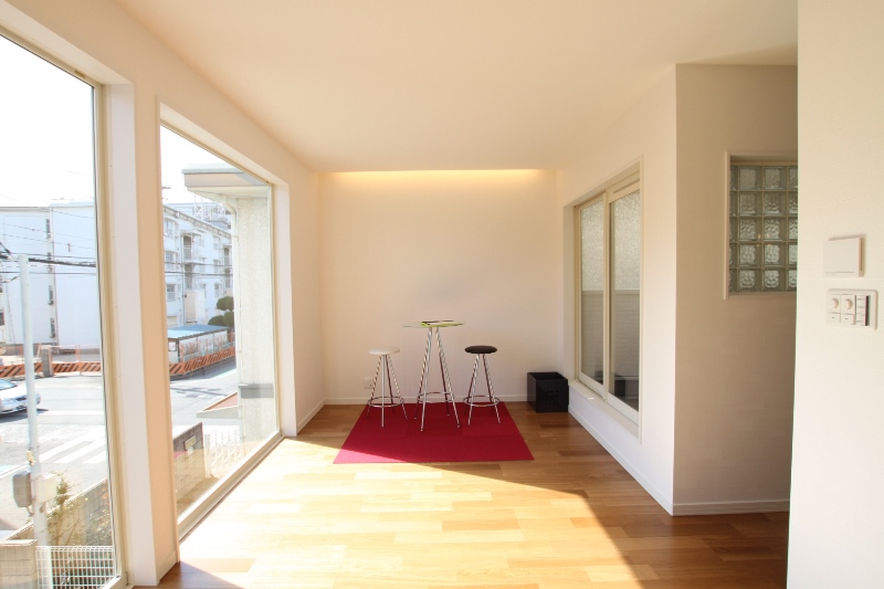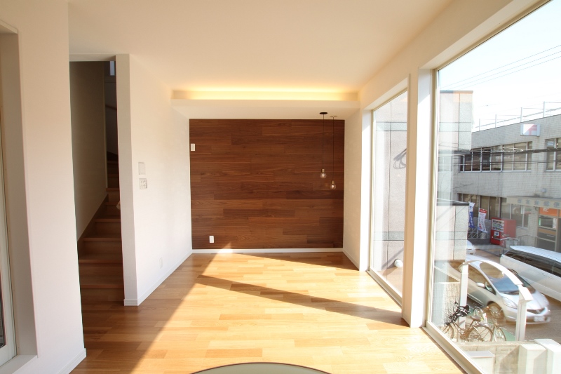 間接照明やペンダントライトを上手く使ったライティングが優しい雰囲気の内観。家の真ん中に設けられた中庭とバルコニーが部屋の奥まで光を届けてくれます。