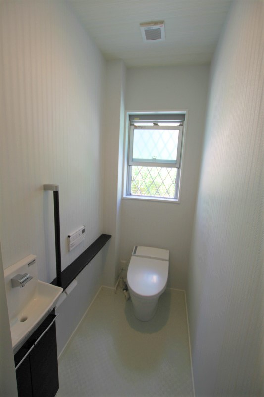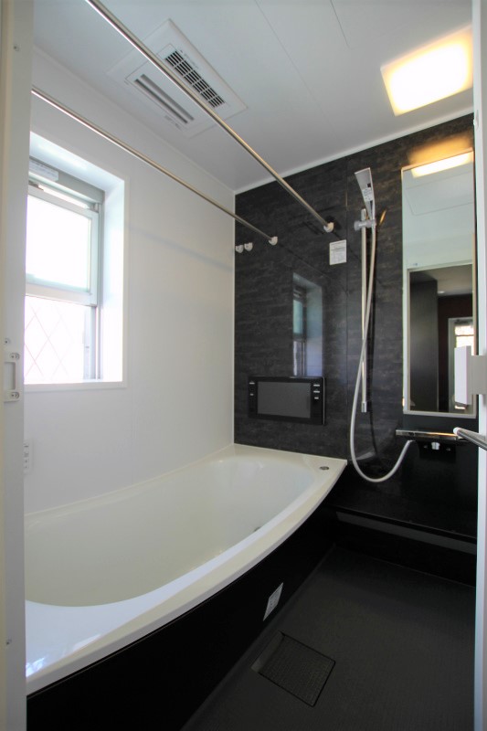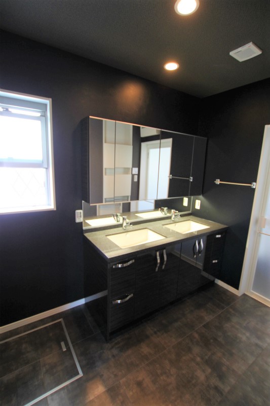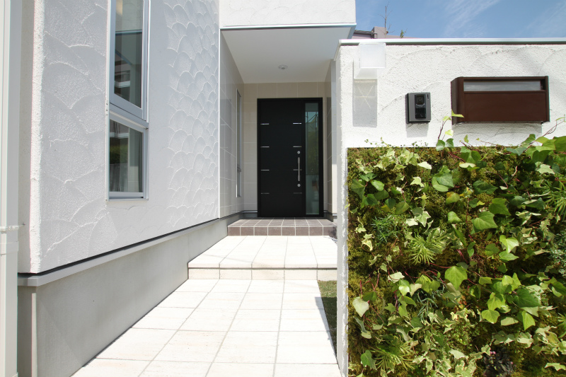 芝生や壁面緑化、シンボルツリーなどいたるところに散りばめられたグリーンが心を癒すハイキューブ豊中上野坂。ギャップを狙ったシックな色づかいの水回りもポイント。